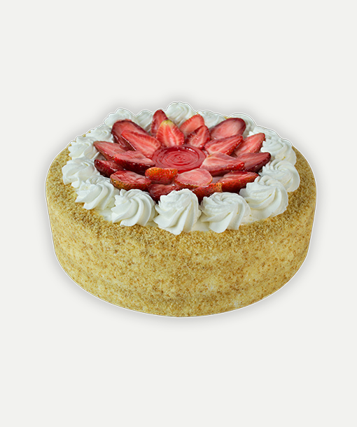 Bizcocho de vainilla, relleno de crema pastelera y jalea de fresa, decorado con fresas.